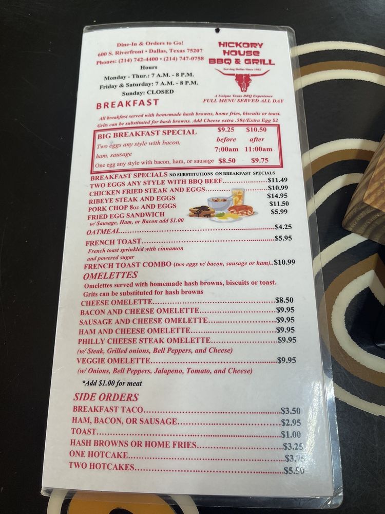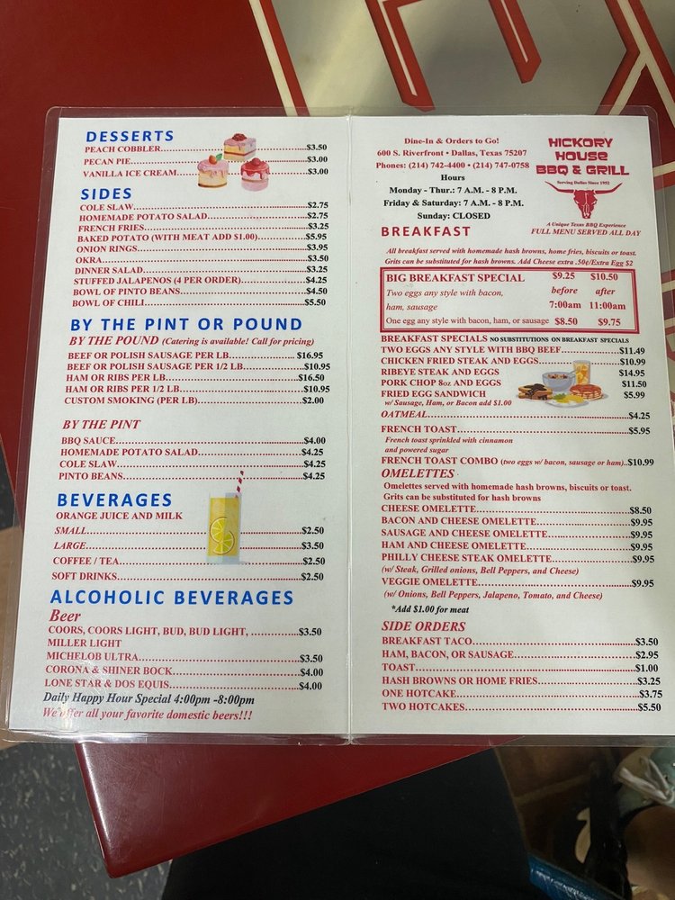 Located in Dallas, TX, Hickory House Barbecue offers a variety of dishes, including burgers, tacos, and barbecue options. The menu boasts options like the Special Chef Salad, Enchilada Dinner, and a mouth-watering Double Cheese Burger. Customers rave about the juicy burgers, delicious ribs, and perfectly cooked meats. The cozy, old-fashioned atmosphere adds to the dining experience, making it a favorite spot for families and friends. With friendly staff and a welcoming ambiance, Hickory House Barbecue is a must-visit for those looking for tasty comfort food. Don't miss out on their daily specials, brisket, and ribs. Whether you're a local or a visitor, this place is sure to leave you satisfied and coming back for more.